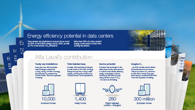 Los expertos en sostenibilidad de Alfa Laval colaboran estrechamente con socios de todo el mundo en prácticamente todos los sectores imaginables. ¿Cuánto podemos reducir el consumo de energía en las refinerías? ¿Y reducir la huella de carbono de los 'datacenters'? ¿Tiene curiosidad por saber cuánta energía podría ahorrarse en el sector químico, en los edificios y en la construcción?