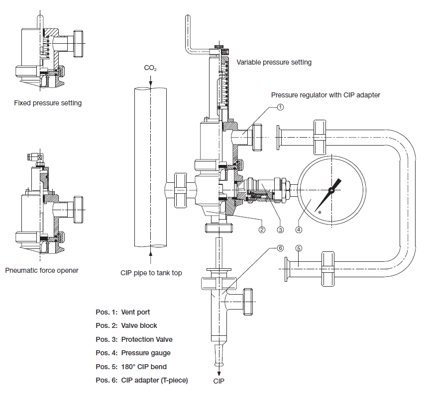 El depósito del regulador de presión debe limpiarse entre cada lote. Se integra en el procedimiento CIP del depósito mediante el adaptador CIP opcional. Antes de la limpieza, el adaptador CIP se monta en el regulador de presión del depósito; este abre a la fuerza la válvula de suministro de gas y la válvula de alivio de presión, lo que permite limpiarlas por completo. Durante el procedimiento CIP, todas las funciones quedan bloqueadas. Véase el esquema del regulador.